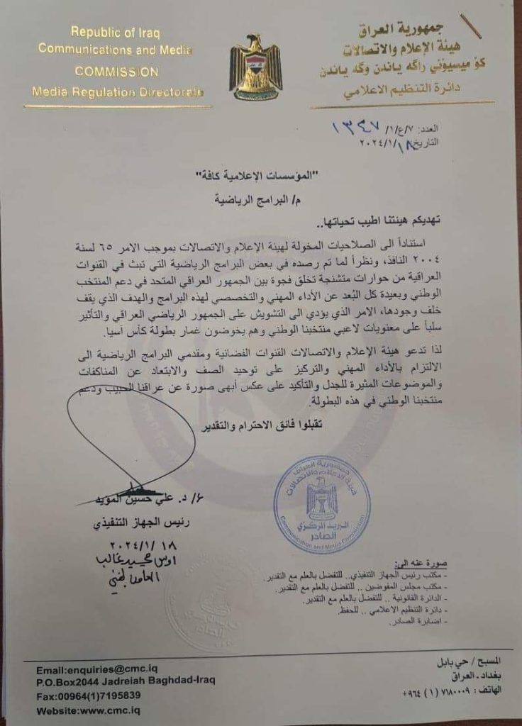 18 يناير 2024بالوثيقة .. هيئة الاعلام والاتصالات تدعو القنوات الفضائية ومقدمي البرامج الرياضية الى الالتزام بالاداء المهني