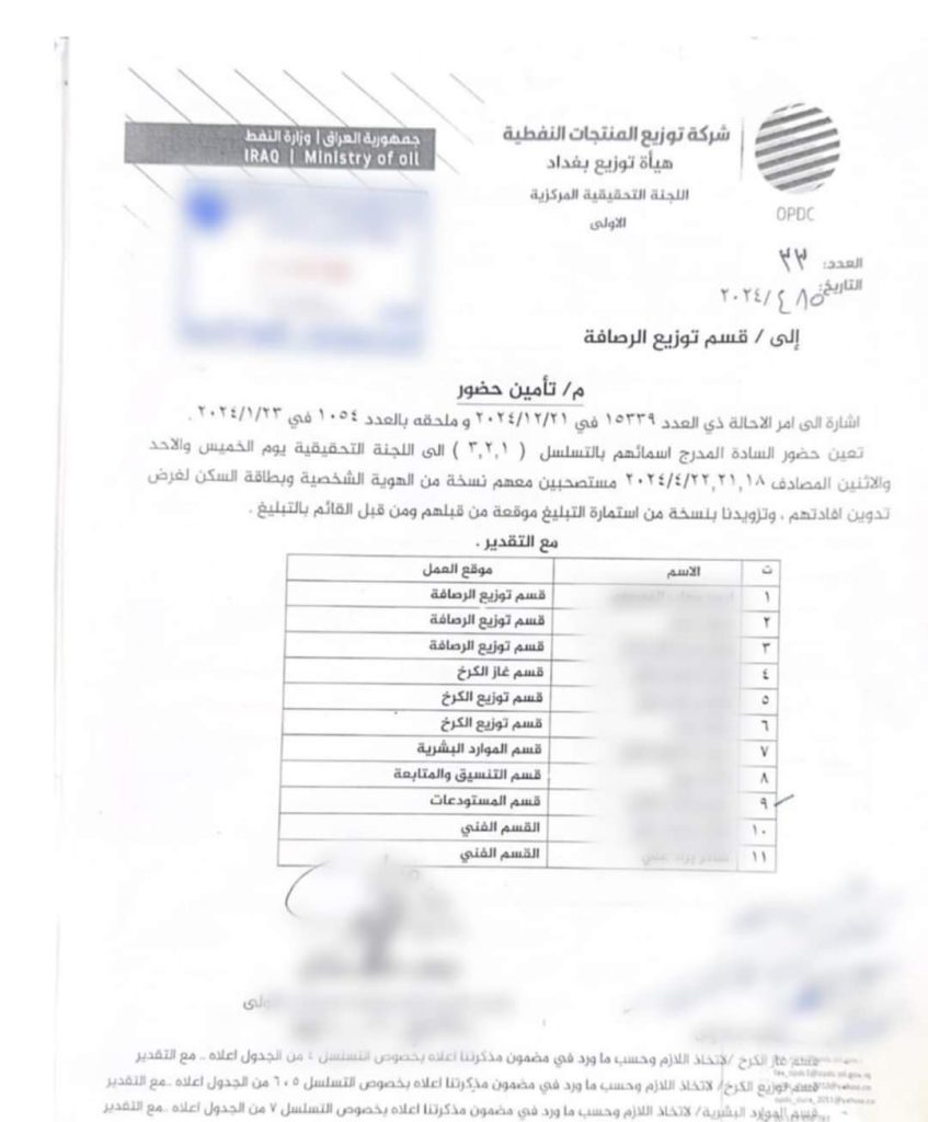 وأشارت وثيقة حصلت عليها “بصمة برس”، الى ” تعين حضور السادة المدرج اسمائهم بالتسلسل ( 3,2,1 ) الى اللجنة التحقيقية يوم الخميس والاحد والاثنين المصادف 18,21,22/4/2024 مستصحبين معهم نسخة من الهوية الشخصية وبطاقة السكن لغرض تدوين افادتهم، وتزويدنا بنسخة من استمارة التبليغ موقعة من قبلهم ومن قبل القائم بالتبليغ”.